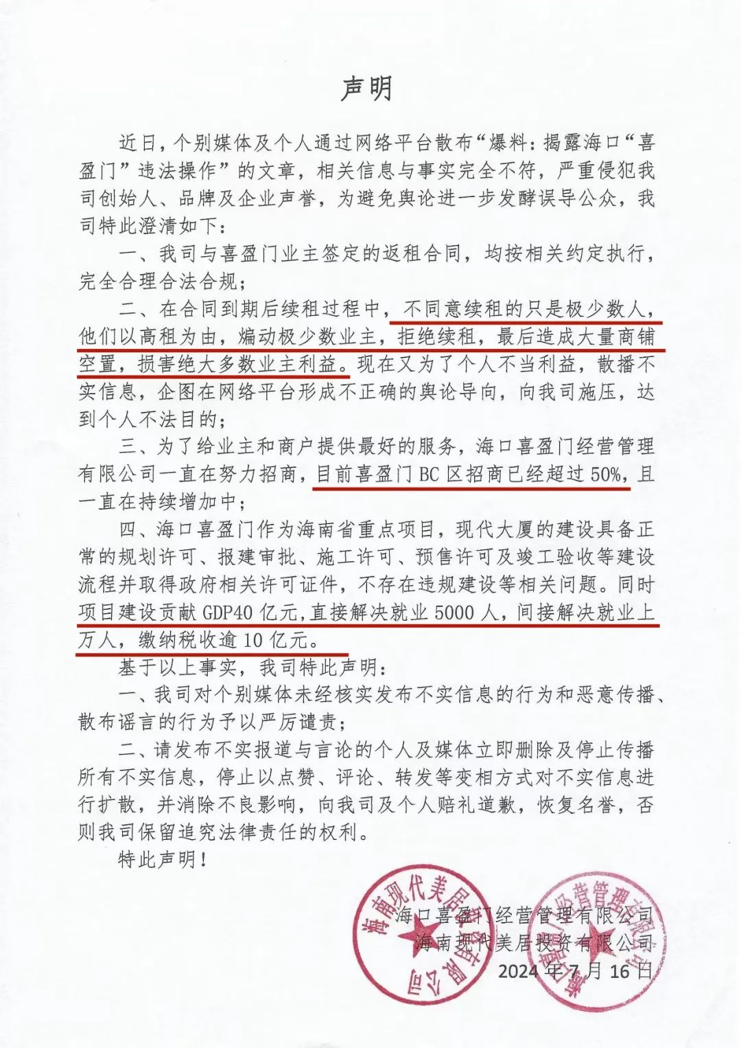 这是海口喜盈门开发商发布的一份厚颜无耻的声明!当年1270个业主,委托业主不到30%,开发商却十分厚颜无耻地说,只有极少数人没有委托就造成了大量商铺空置。现场的实际出租率不到20%,大部分出租的是周边临街铺面,里头不到10%,他却说有50%,欺骗政府和社会大众。它涉嫌严重的偷税漏税的问题。实际就业不到1000人,他却说有5000人。他为啥要这样说呀,他在向政府求援,向政府示威,提醒政府,处罚他后果会很严重。这样厚颜无耻的企业,却是海南的明星企业!这是海南人民的耻辱!